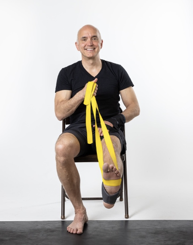 Use of yoga strap to lift the affected lower extremity.