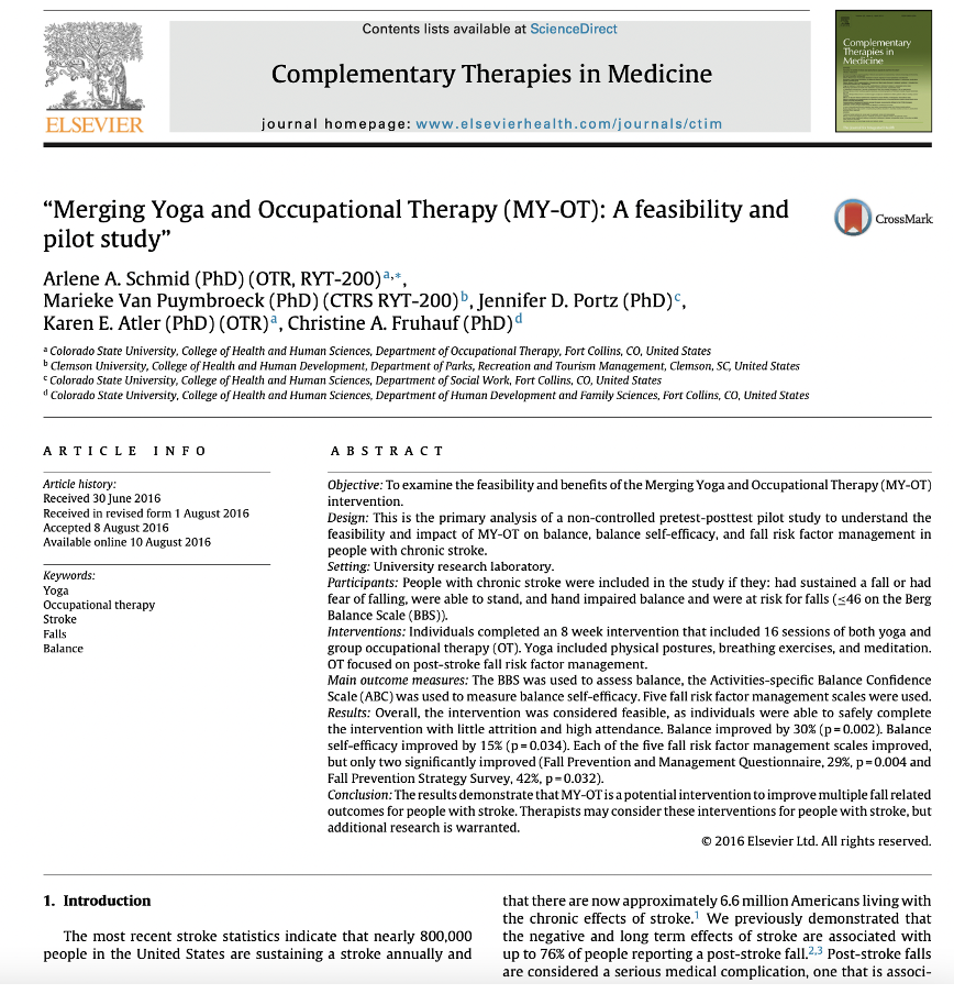 Schmid, Arlene., Marieke Van Puymbroeck, Jennifer D. Portz, Karen E. Atler, Christine A. Fruhauf. (2016). Merging Yoga and Occupational Therapy (MY-OT): A feasibility and pilot study. Complementary Therapies in Medicine. Vol. 28, pgs 44-49. ISSN 0965-2299. https://doi.org/10.1016/j.ctim.2016.08.003.