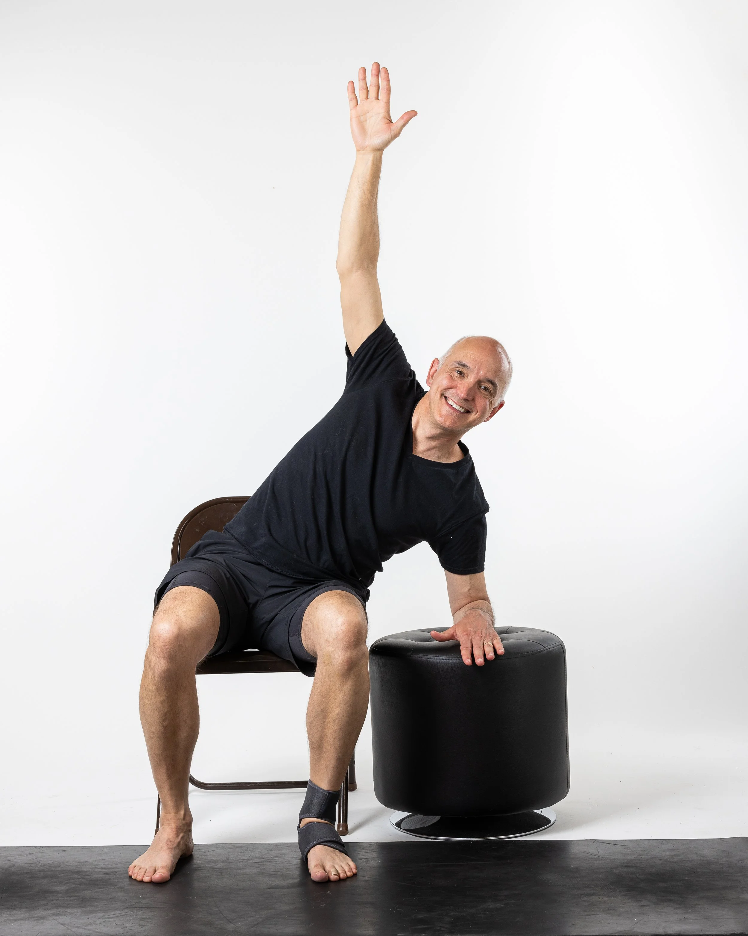 Option to lean back in chair, engaging core muscles, raising one or both legs off the ground. Hold for 5 seconds.